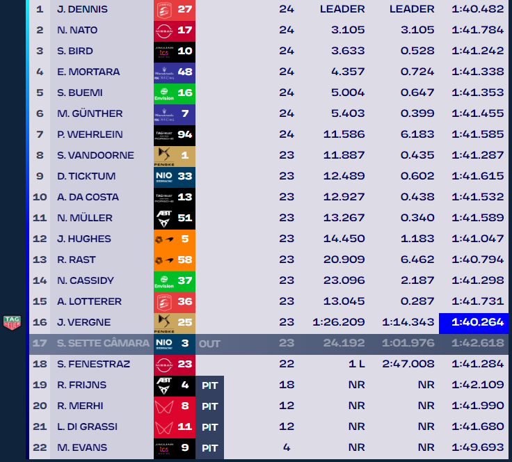 Safety Car, con Dennis davanti a Nato, Bird e un ottimo Ticktum, Si riparte al giro 4, e subito ci sono i primi Attack Mode, con Da Costa, Vergne, Di Grassi, Vandoorne, Muller, Frijns, Cassidy, Fenestraz, Mehrhi e Rast che usano la prima attivazione. A questo punto, con anche Wehrlein nono, per Dennis, primo, la situazione del campionato si mette davvero bene, anche perché al quinto giro Evans rientra nel garage.