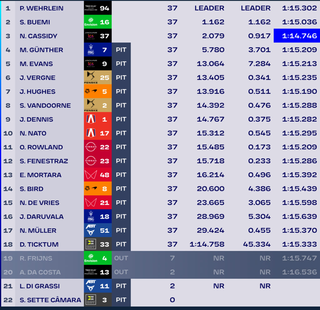 Ma i colpi di scena non finiscono qui in quanto sia Jake Dennis che il campione di giornata Pascal Wehrlein sono sotto investigazione per un infrazione del regolamento tecnico che verrà valutata a fine gara quindi le sorti del E-Prix possono ancora cambiare. Per ora la classifica è la seguente con Nick Cassidy che si aggiudica il giro più veloce: