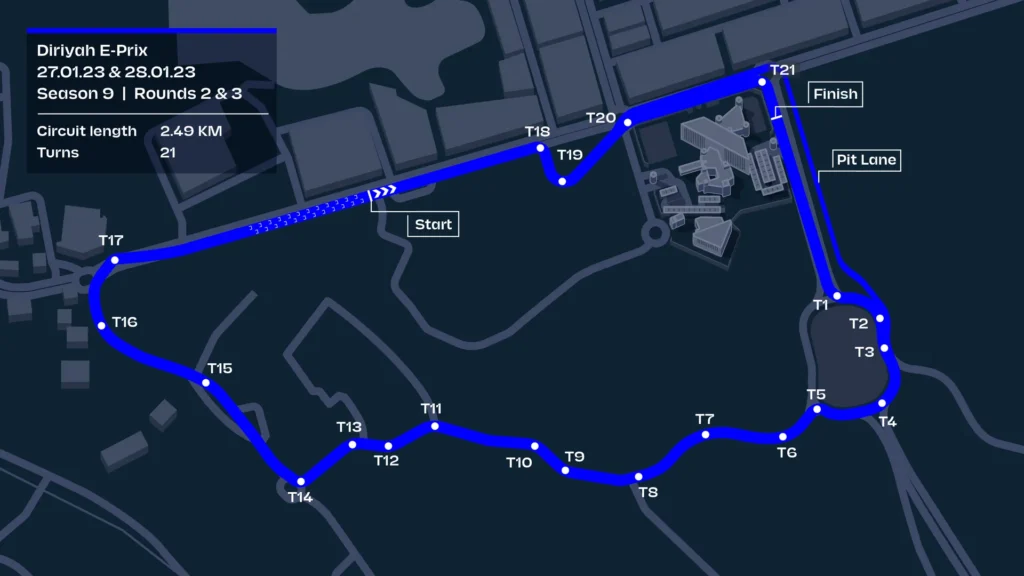 Il circuito di Ad-Diriyah, situato nei pressi del sito patrimonio dell’Unesco di At-Turaif, è uno dei più tecnici e complessi del calendario. Lungo 2495 metri (e con un offset tra la linea di partenza e quella del traguardo di 590 metri), ruota in senso orario e presenta la bellezza di 21 curve, 12 a destra e 9 a sinistra. Nonostante due rettilinei discretamente lunghi, quello di partenza tra curva 17 e curva 18, e quello d’arrivo tra curva 21 e curva 1, si caratterizza soprattutto per il lungo tratto di cambi di direzione che va da curva 1 a curva 14: quest’anno potrebbero essere persino più impegnative degli altri anni, poiché le nuove gomme Hankook sono più dure delle precedenti Michelin, cosa che rallenta le vetture nelle curve lente, visto il minor grip. Minor grip che sarà un fattore rilevante anche per l’altra caratteristica principale del circuito, ossia il fatto di trovarsi nel deserto: questo comporta anche che il vento porti in pista un’ingente quantità di sabbia, a ridurre ancora l’aderenza. Infine, c’è da ricordare che, a differenza di Città del Messico, l’asfalto qui è quello di una normale strada urbana, e questo riduce ancora di più l’aderenza, e che tale asfalto sarà anche abbastanza freddo, visto che si corre con il buio.
