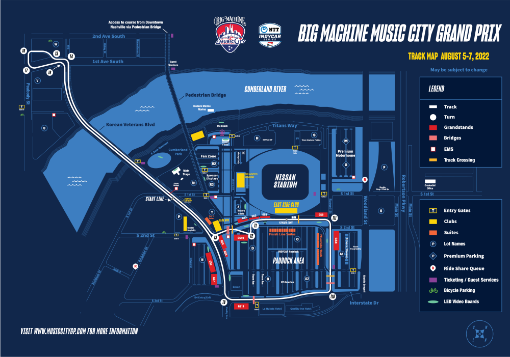 Il circuito del Tennessee (il quinto e ultimo cittadino della stagione) può essere fondamentalmente descritto come una “Baku sottodimensionata”. Lungo 2.1 miglia (3.380 km), ruota in senso antiorario e presenta 11 curve, 7 a sinistra e 4 destra. La principale caratteristica di questo tracciato sono però i due lunghissimi rettilinei che si snodano sui due sensi opposti della Korean Veteran Boulevard, uno dei ponti che tagliano il fiume Cumberland, e che permettono di raggiungere velocità di punta elevate, anche se poi il resto del tracciato è molto lento (specie la parte da curva 4 a curva 8), richiedendo quindi un bilanciamento molto particolare. Qui, sul ponte, vi è anche la linea di partenza, che ricordiamo, in America è lanciata, ma non quella di arrivo, che sarà situata accanto al Nissan Stadium, lo stadio dei Tennessee Titans, la locale squadra di football americano che compete nella NFL. La pista andrà percorsa per 80 giri, per un totale di 168 miglia (270.369 km), con una gara che sarà quindi massacrante sia dal punto di vista fisico che meccanico. Qui sotto troverete il disegno della pista. Attenzione: sono immagini forti.