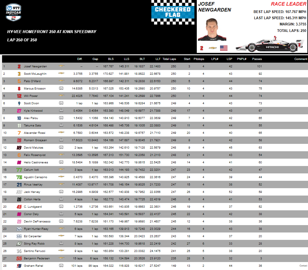 Era il favorito indicato, per via sia delle sue quattro vittorie ottenute in Iowa, che per la sua vittoria sull’ultimo ovale in cui si è corso quest’anno, ossia Indianapolis. E Josef Newgarden non ha deluso le aspettative, conquistando una vittoria perentoria che gli permette di accorciare in classifica. Lo statunitense, partito terzo, dopo essersi liberato di McLaughlin, ha preso il comando della corsa intorno a metà gara passando Will Power, partito dalla pole. Giornata sfortunata per il campione in carica, che per via di un contatto con le barriere ha danneggiato la sua Dallara-Chevy, perdendo ritmo e posizioni: alla fine ha chiuso solo quinto, “graziato” dall’onta del doppiaggio da parte di Newgarden. Tra i due hanno quindi chiuso McLaughlin, che sebbene a tratti sembrasse avere il ritmo di Newgarden ha deficitato in costanza, e O’Ward, sempre a suo agio su questa pista. Gara di conserva per Palou, non particolarmente a suo agio su questa pista, il quale ha chiuso solo ottavo sfruttando qualche problema di usura degli pneumatici dei piloti che gli partivano davanti. Proprio l’usura delle gomme è stato un fattore chiave della corsa, con stint molto più corti degli 85 giri preventivati, e questo a causa di una temperatura più alta che nelle prove. Nonostante questo, c’è stato un solo incidente, occorso a Rahal, con i piloti che hanno comunque dimostrato di sapersi adattare alle condizioni della pista.