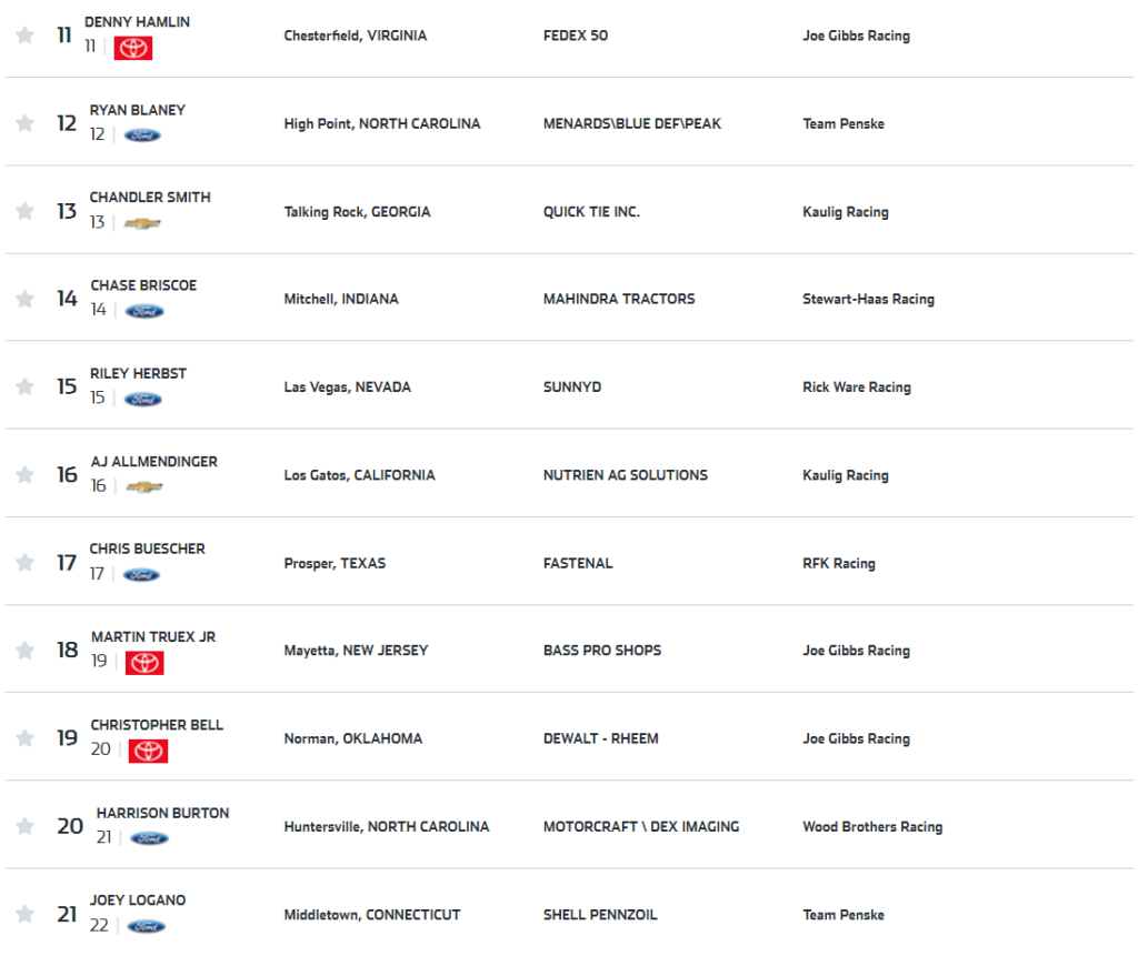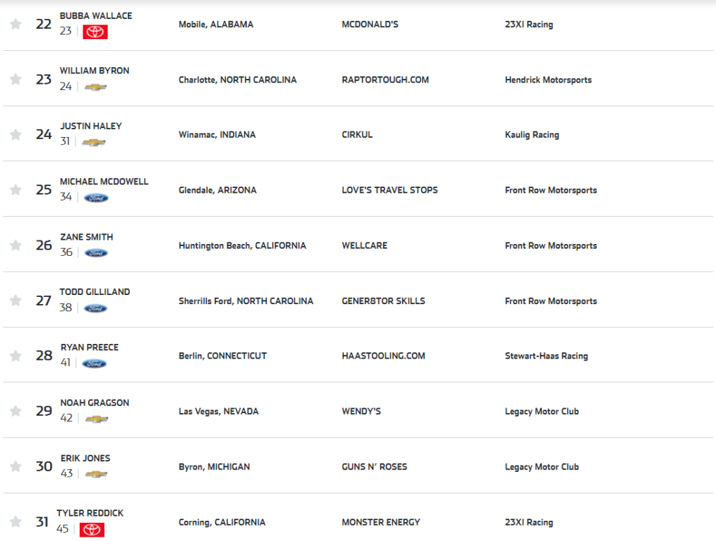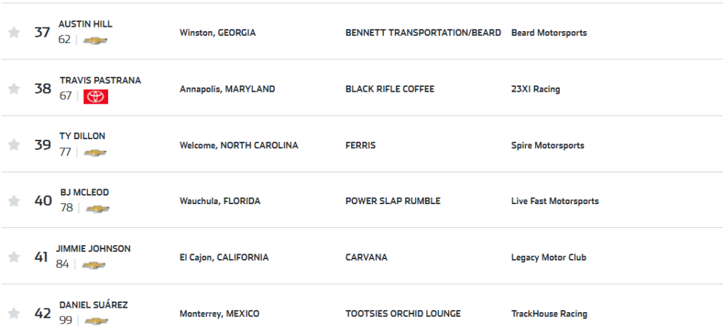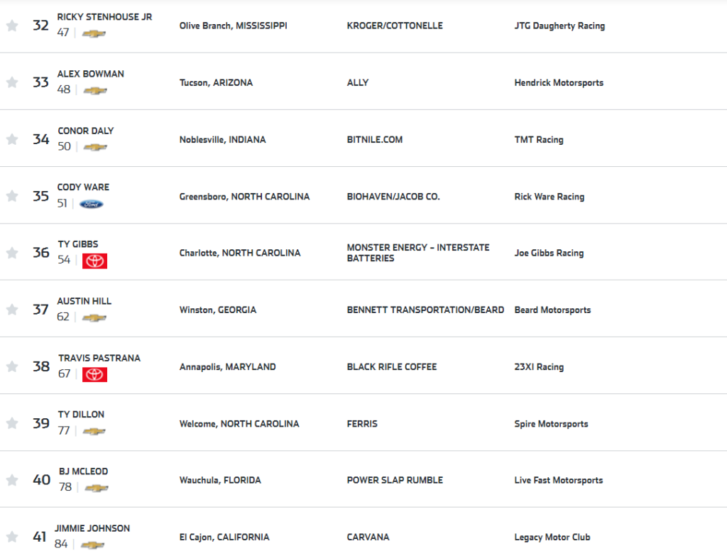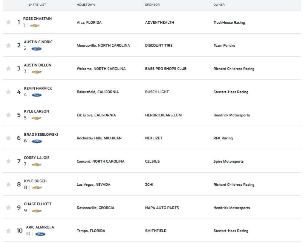 Ora, lo so che il paragrafo è intitolato “entry list e favoriti”. Ma la verità è che non esistono dei favoriti in questa categoria. La caratteristica principale della Nascar è la sua imprevedibilità, e infatti potenzialmente potrebbero vincere, se non tutti e quaranta, almeno una trentina di concorrenti. Scie, incidenti, neutralizzazioni, doppiati, pit stop: una qualunque di queste cose potrebbe essere il battito d’ala di farfalla che può portare da una sicura vittoria ad una catastrofica sconfitta, e viceversa.