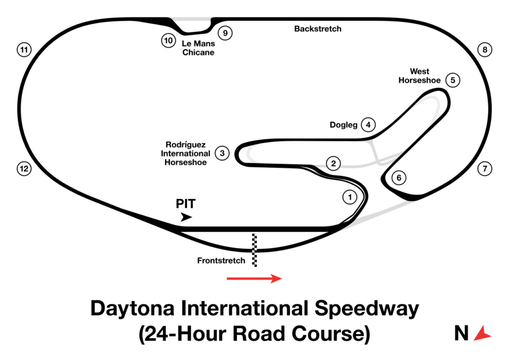 5.729 km compongono il nastro di asfalto della pista realizzata all’interno dell’immenso catino artificiale di Daytona Beach, Florida. L’assalto alla coppa e agli ambitissimi orologi Rolex Daytona avverrà proprio nell’infield dello Speedway inaugurato nel 1959 per ospitare la più popolare NASCAR e che, dal 1966, ospita anche la 24 Ore di Daytona. “Solo” 13 sono le curve che legano i tratti rettilinei, ma ben due sono le sopraelevate dello Speedway. Queste, caratterizzate da un’inclinazione (banking) di ben 31° (equivalente a circa il 60%) rappresentano una grande sfida soprattutto in fase di sorpasso di GTP nei confronti di vetture più lente, per non parlare delle fasi notturne o di quelle eventuali sotto la pioggia. Le vicine SAFER Barriers sono pronte ad assorbire parte dell’impatto di ogni malcapitato che dovesse perdere il controllo.