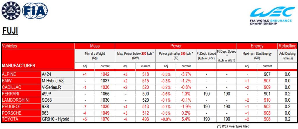 Cresce il peso per Toyota, con i padroni di casa che, come ad Austin, ricevono 5 kg di zavorra aggiuntivi, che portano le GR010 a 1070 kg. Colpita anche la potenza (-4 kW), che cala quindi a 493 kW (670 CV), con power gain aumentato di un ulteriore 0.8%.
