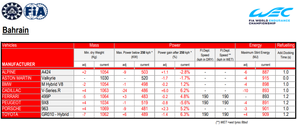 Nonostante il quinto posto al Fuji, e una condotta di gara molto convincente per lunghe tratte, la Aston Martin Valkyrie mantiene il miglior trattamento possibile, a 1030 kg e 520 kW. Diventa però negativo il power gain. Molto leggera anche Peugeot, soli 4 kg in più di Aston, con 1 kW in meno e power gain bassissimo, a -5.6%. La 9X8 paga ovviamente la grande efficienza alle alte velocità del suo pacchetto. A 1054 kg troviamo BMW e Alpine, con i bavaresi fermati a 498 kW, mentre i francesi avranno a disposizione 503 kW. Il power gain ribalta però gli equilibri, rendendo la M Hybrid V8 più potente della A424 sopra i 250 km/h. 5 kg in meno per Ferrari, a 1064, mentre Cadillac si becca +4 kg, arrivando a essere solo 1 kg più leggera dell’Hypercar italiana. Batosta incredibile per la V-Series.R, che visti gli ottimi risultati recenti perde ben 24 kW, rimanendo solo 3 kilowatt più potente della 499P. Entrambe, viste le potenze così basse, hanno importanti power gain (+4.8 e +6.2%). Discorso molto simile per Toyota, che scende di peso arrivando 1 kg sotto Cadillac e a 2 da Ferrari, con potenza di 489 kW (+6 dalla rossa, +3 da Jota). Per i giapponesi, con leggermente più potenza e meno peso dei concorrenti diretti summenzionati, anche un minimo vantaggio di power gain. Arriviamo quindi a Porsche, che con +4 kg e -9 kW si trova a essere l’Hypercar più pesante e meno potente, a 1069 kg e 481 kW. La 963 ha un buon power gain, +5.2%, tra le top4 superiore però solo a Ferrari. Scende per tutti l’energia massima per stint, Ferrari (±0) e Toyota (+4) escluse. Disponibili come sempre i valori massimi per camber e pressione gomme, richiesti dai fornitori unici Goodyear e Michelin e fonte di specifici controlli tecnici.