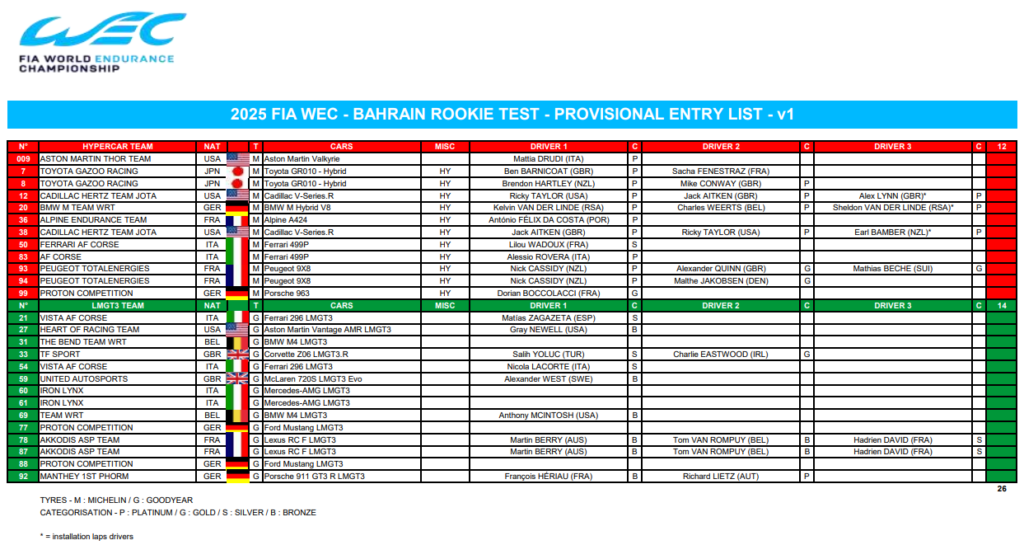 La prima versione della entry list dei test post gara riservati agli esordienti presenta 12 Hypercar e 14 LMGT3, variamente composte. Non è escluso, anzi è altamente possibile, che ci siano aggiunte tra i piloti, mentre è improbabile che saranno schierate ulteriori auto.