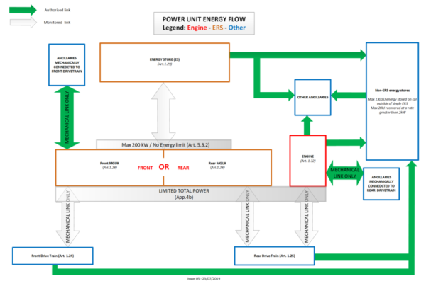 Il motore deve pesare almeno 165kg, può essere montata una unità prototipo o di produzione (quest’ultima solo con specifiche condizioni di uso in una serie racing e con piccola produzione stradale). Le Hypercar di tipo derivato stradale possono usare il motore della road car oppure una unità propulsiva ricavata da un altro motore dello stesso gruppo industriale. Il cambio (con corpo solo in magnesio o alluminio, con peso minimo di 75kg) può avere al massimo 7 marce. Si possono omologare solo due set di rapporti del cambio. Il motore deve sempre potersi accendere da solo (sia in garage che in pitlane o in griglia), senza attrezzatura esterna. I costruttori possono scegliere se usare o meno un sistema ibrido, prodotto in serie o realizzato dal team, che sarà sempre montato all’anteriore se la macchina è prototipo, altrimenti può trovarsi al posteriore se l’auto è una hypercar derivata stradale che nasce con tale configurazione. Il corpo del ERS deve essere in alluminio, non possono essere usati internamente materiali quali cobalto, oro o argento, è vietato il titanio tranne per le viti. La potenza massima della MGU-K è di 200kW, da sommarsi alla potenza del motore. Il totale non può mai superare la curva di potenza di riferimento dell’allegato 4b +3% oppure la curva che rappresenta un picco di 520kW. I sensori di coppia certificano che l’auto stia rispettando il regolamento. Il motore elettrico comunque può intervenire solo sopra i 120km/h se la pista è asciutta, oppure a un valore variabile (dalla direzione gara) tra 140 e 160km/h se sono montate le gomme da bagnato. Sono vietati gli scarichi soffiati, se il motore è sovralimentato non può avere la geometria variabile (tranne per i motori rotativi, per cui è ammessa) e deve avere al massimo 4 valvole per cilindro, di tipo “classico”, sono vietate le valvole pneumatiche o elettromagnetiche.