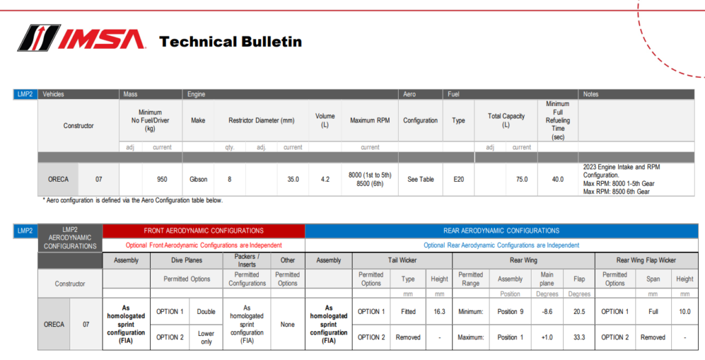 Per la 24H di Daytona quindi c’è molta apprensione per l’affidabilità da parte di tutti i team, mentre le prestazioni delle LMP2, che nel WEC abbiamo visto infastidire le Hypercar agli esordi, non dovrebbero essere un problema in IMSA. In ogni caso per la prima gara della stagione l’organizzazione si è coperta con una serie di modifiche al BoP, abbassando il limitatore del Gibson V8 da 8700 a 8000 rpm (8500 in sesta marcia). Non c’è una diminuzione dei litri del serbatoio come nel WEC ma viene imposto un tempo minimo di rifornimento di 40 secondi (erano 10″ l’anno scorso), mentre il peso minimo sale da 940 a 950 kg. Viene ridotta la personalizzazione aerodinamica, ma non bloccata del tutto come nel Mondiale Endurance. Ci sono due opzioni che vedono un numero differente di dive planes e di wicker tra anteriore e posteriore. Praticamente due configurazioni alto e basso carico. Ancora nessun BoP per le GTP, verrà sicuramente deciso dopo il Roar della settimana precedente alla 24H.