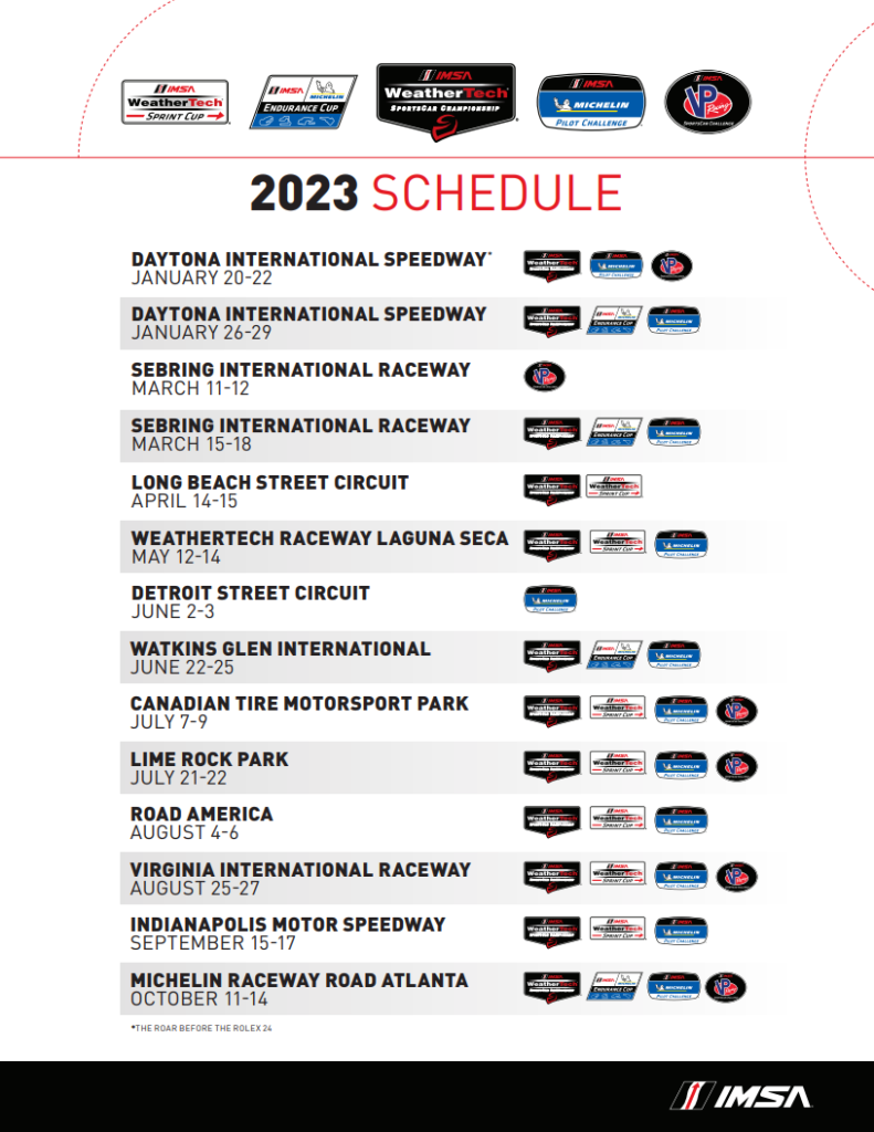 Questo invece il calendario IMSA, per quanto riguarda il WeatherTech SportsCar Championship, con date e durata delle gare: