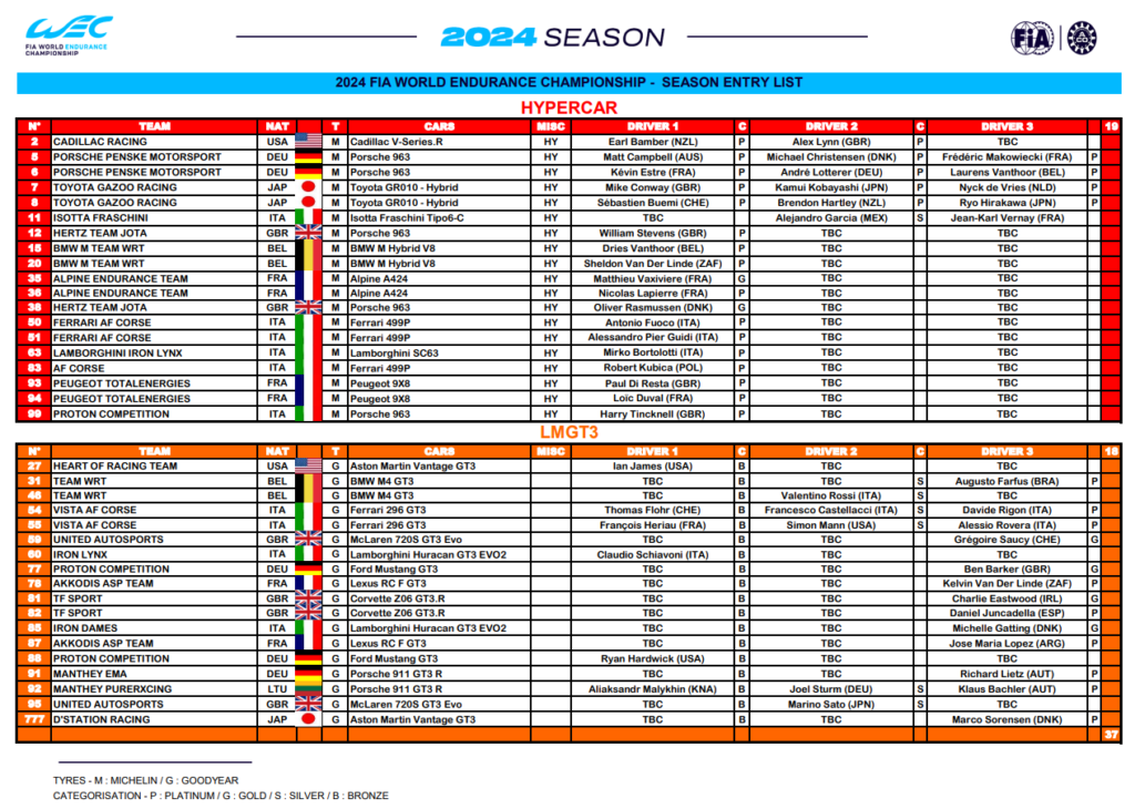 Quasi superfluo sottolineare la conferma di Toyota, Ferrari, Porsche e Peugeot, tutte con due equipaggi iscritti. Cadillac, nonostante i piani del passato relativi all’espansione del programma, aveva già confermato la presenza nel 2024 di una unica auto, che al momento presenta solo due piloti in equipaggio. Gli americani si stanno confrontando con ACO per capire se sia possibile correre in tali condizioni, almeno nelle gare da 6-8 ore. Una indagine simile, registrata dai documenti ufficiali, la sta portando avanti Hertz Team Jota, che non solo conferma l’iscrizione della 963 #38 ma raddoppia, schierando una seconda Porsche clienti con livrea dorata. Dopo l’inizio tardivo nella stagione appena conclusa è confermata per tutta la stagione un’altra LMDh clienti tedesca, quella schierata dagli uomini di Proton Competition.