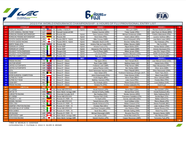 Probabilmente al Fuji vedremo ancora una volta una grande sfida Toyota vs Ferrari, coi giapponesi leggermente favoriti, mentre sarà interessante seguire anche le prestazioni di Porsche e Cadillac, che devono cercare di recuperare il podio, ottenuto a Monza da Peugeot, che ha finalmente fatto segnare il primo risultato di spessore dall’esordio. I francesi dovranno però fare a meno dell’infortunato Nico Muller, che lascia il posto a Stoffel Vandoorne. Assente Glickenhaus, che come l’anno scorso evita le costose trasferte extra europee. In LMP2 c’è WRT #41 al comando del campionato, inseguita a 10 punti dai polacchi di Inter Europol. Più staccata la United Autosports #22. Corvette, devastante quest’anno, ha già stravinto il titolo GTE. Con meno della metà dei punti degli americani si giocano la piazza d’onore Iron Dames, Ort by TF e Dempsey-Proton, compressi in 7 punti. Si rivede Northwest AMR (gestita da Heart of Racing) che due mesi fa aveva preferito correre in GTD a Mosport in IMSA invece che a Monza.