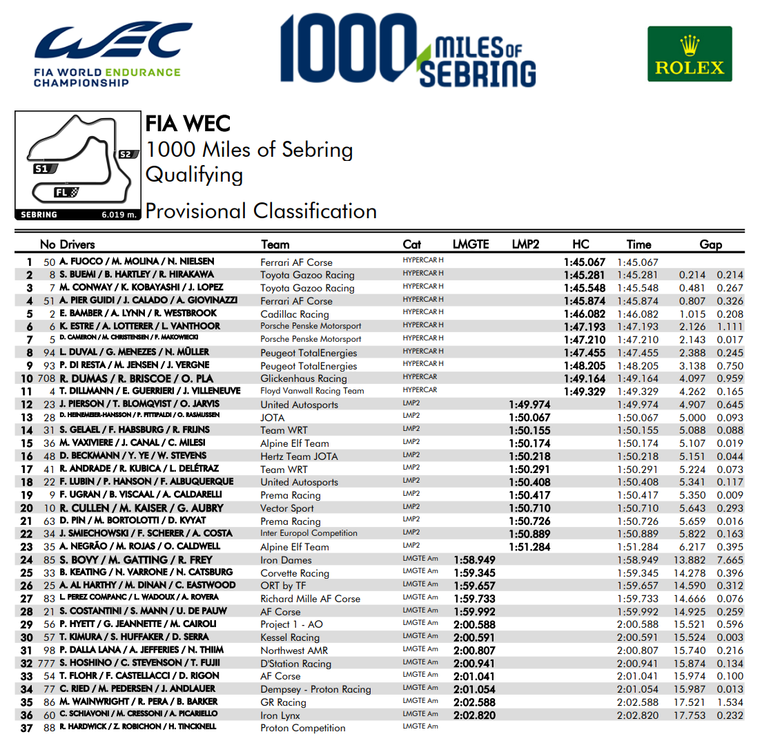 Dopo 50 anni grandioso ritorno in classe regina nelle corse endurance per Ferrari, che a sorpresa conquista la pole position in terra americana con Antonio Fuoco alla guida della 499P #50. Seguono da vicino le Toyota, seconda e terza. In LMP2 e GTE Am primo posto di United #23 e Iron Dames.
