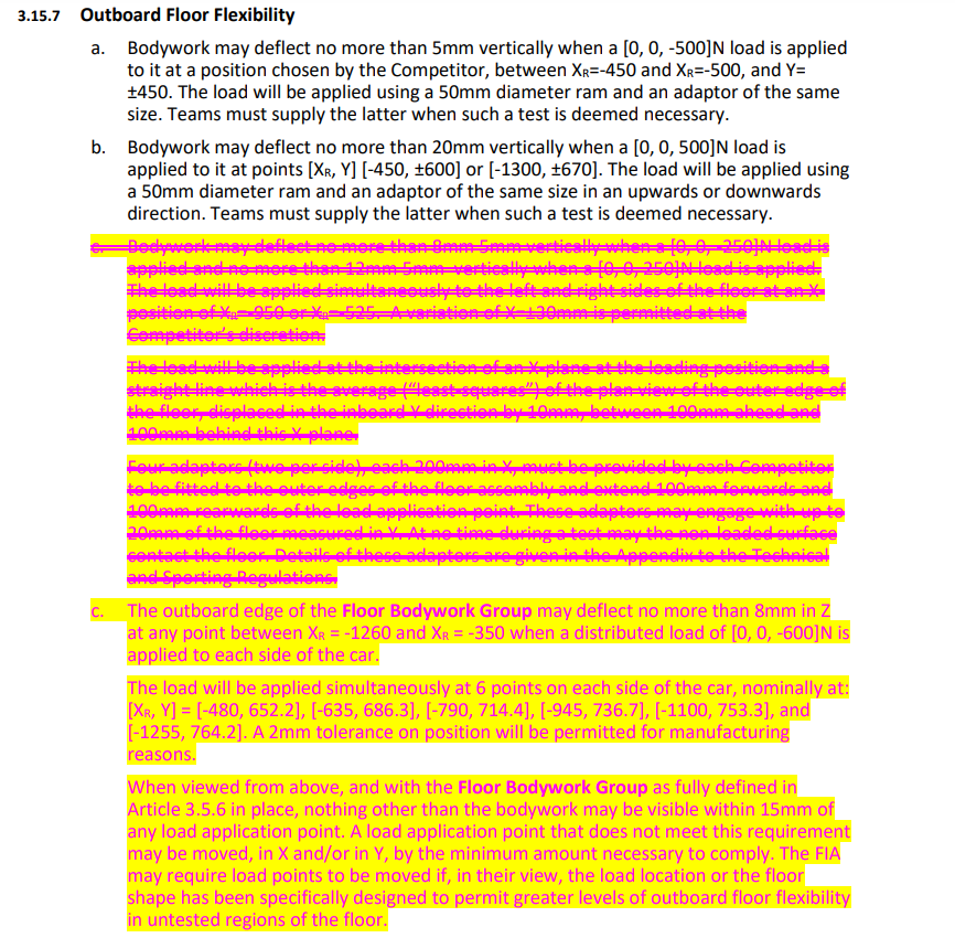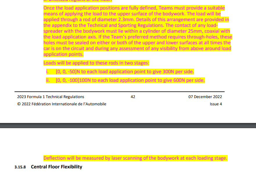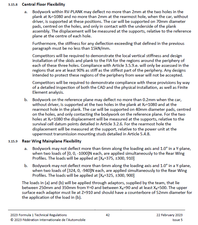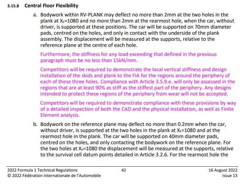 Nell’estate 2022 il regolamento tecnico della Formula 1 fu modificato per “questioni di sicurezza” introducendo 3 paragrafi all’articolo 3.15.8a, quello che definisce i limiti di flessibilità del plank e dello skid. Con tale modifica veniva specificata la rigidità minima, veniva richiesto ai team di portare alla FIA delle simulazioni FEM che aiutassero a dimostrare il rispetto del regolamento e veniva specificato come le misurazioni sarebbero state effettuate da Spa in poi. Insieme a questa modifica veniva resa effettiva la metrica (la già citata AOM, Aerodynamic Oscillation Metric) introdotta all’inizio dell’estate che serviva per misurare le oscillazioni verticali delle vetture. In linea teorica il superamento di questi limiti per più di tre gare avrebbe portato a conseguenze dal punto di vista sportivo, ma già da Singapore i valori da rispettare erano stati stati resi meno restrittivi per paura che la superficie stradale sconnessa portasse le squadre a superare i limiti concessi.