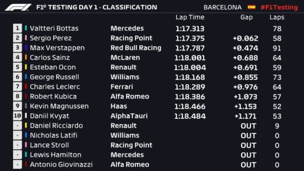 Alle spalle del finnico, che ha completato 78 passaggi prima di fare spazio a Lewis Hamilton secondo l’alternanza giornaliera tra piloti che ormai da anni caratterizza il lavoro invernale degli uomini di Brackley, si è piazzato Sergio Perez. Il messicano, al volante di una RP20 molto diversa da quella presentata pochi giorni fa sulle sponde del Lago Mondsee e clamorosamente somigliante alla stessa Mercedes, ha chiuso la propria mattinata accusando solamente 62 millesimi di ritardo dal crono di Bottas, mettendo assieme 58 giri e facendo registrare la miglior prestazione con un set di Pirelli C3. Staccato di quasi mezzo secondo dal crono del #77 è poi Max Verstappen, 3° al volante della RB16 e stakanovista di questa prima mattinata iberica: l’olandese – che come tutti non ha minimamente cercato la prestazione, dato che in moltissimi passaggi non ha neppure utilizzato il DRS – ha completato ben 91 giri, il migliore dei quali in 1’17″787 utilizzando un treno di Pirelli C2.