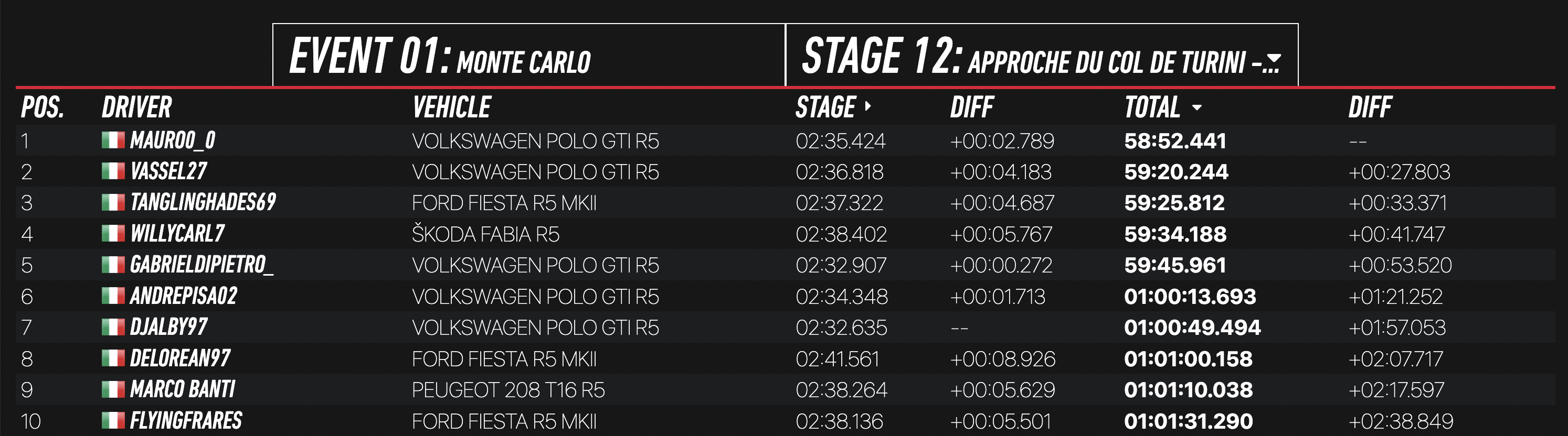 Il Rally di Monte-Carlo del nostro torneo su Dirt 2.0 va in archivio con la vittoria di Mauro0_0, che con un tempo complessivo di 58’52″441 riesce ad avere la meglio su Vassel27 e TanglingShades69, 3° davanti a WillyCarl7. GabrielDiPietro_ chiude al 5° posto, mentre AndreaPisa02 è il primo dei piloti virtuali ad avere completato il rally in più di un’ora. DJAlby97 è 7°, davanti a Delorean97 e a Marco Banti, mentre FlyingFrares completa la top ten dalla quale il sottoscritto è invece escluso perché non è riuscito a disputare il rally che lui stesso ha organizzato. Il punto aggiuntivo, assegnato al pilota in grado di conquistare più vittorie di Stage, lo conquista Alberto_222_46, velocissimo ma misteriosamente scomparso dalla classifica tra le PS 6 e 7.