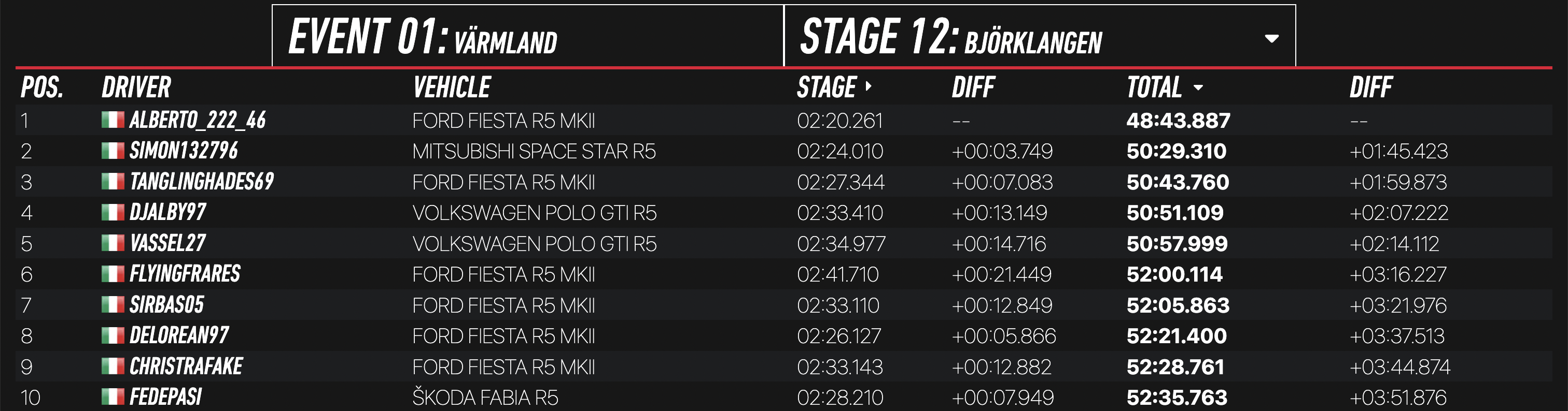Dopo essersi dati battaglia tra le stradine strette e tortuose delle Alpi francesi, i coraggiosi protagonisti del nostro torneo su Dirt 2.0 se la sono dovuta vedere con le innevate e velocissime PS della ghiacciata Svezia. A vincere il secondo appuntamento stagionale è stato Alberto_222_46 che questa volta – essendo riuscito a non svanire misteriosamente tra due PS – si è non solo aggiudicato di nuovo il punto aggiuntivo assegnato al pilota che ha conquistato il maggior numero di Stage, ma ha anche chiuso davanti a tutti nella classifica assoluta. Al secondo posto si è piazzato Simon132796, che ha preceduto al traguardo TanglingShades69, DJAlby97 e Vassel27, ottimo 5° in extremis. FlyingFrares ha artigliato la 6ª piazza davanti a Sirbas05, mentre il duo di redattori di Fuori Traiettoria formato da DeLorean97 e ChriStrafake occupa l’8ª e la 9ª posizione. I due, separati da soli 7″ al termine delle 12 PS in programma, posso assicurarvi che stanno facendo un discreto cinema nei gruppi WhatsApp in cui sono entrambi. A completare la top ten, infine, ha provveduto FedePasi, che con la sua Skoda Fabia R5 ha accusato 3’51” di ritardo dalla vetta.