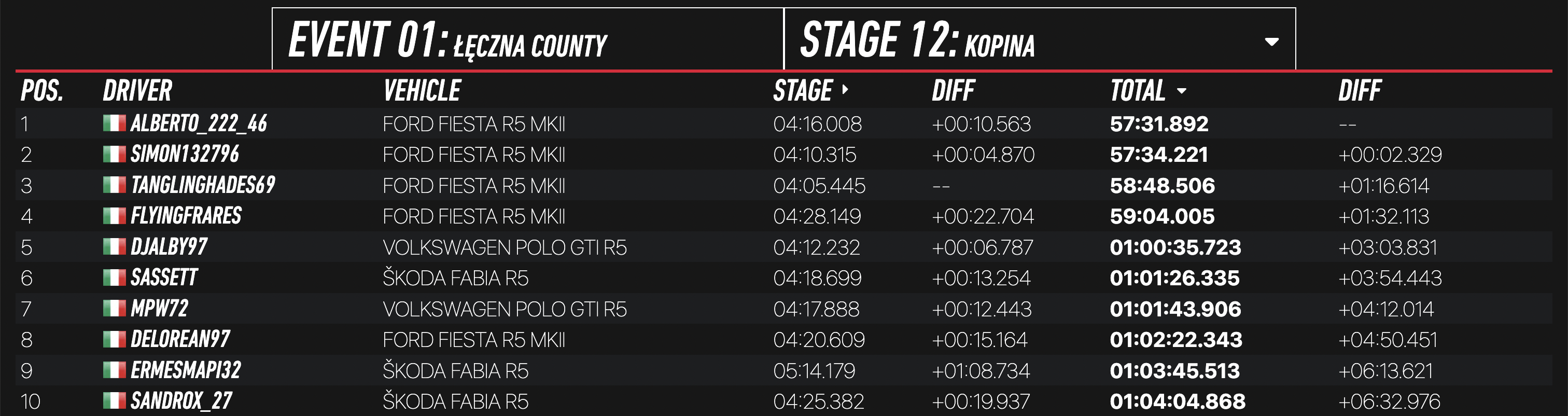 Mandata in archivio anche la tappa svedese, gli intrepidi piloti virtuali che si stanno dando battaglia su Dirt 2.0 hanno dovuto coraggiosamente affrontare gli insidiosi e velocissimi sterrati del Rally di Polonia. A trionfare in uno Stato nel quale sarebbe stato meglio non trovarsi il 1° settembre del 1939 è stato Alberto_222_46, che bissa il successo ottenuto nel Rally di Svezia e che – come tra le innevate PS scandinave – conquista anche il punto aggiuntivo assegnato al pilota che centra più successi di tappa. Alle sue spalle si è piazzato Simon132796, mentre TanglingShades69 ha agguantato il gradino più basso del podio chiudendo davanti a FlyingFrares e DJAlby97. Sassett termina la propria corsa appena fuori dalla top five, mentre MPW72 precede DeLorean97, ErmesMapi32 e Sandrox_27, 10° al traguardo del 3° appuntamento del torneo.