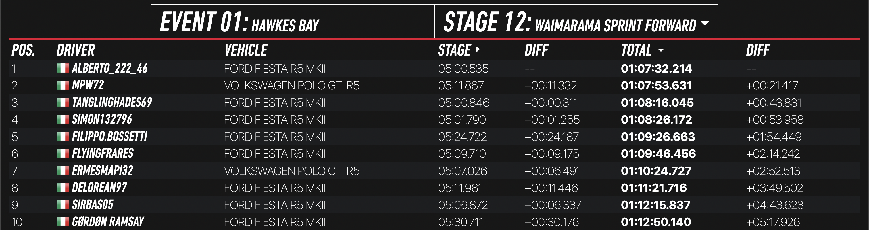 Dopo 17 giorni di intensa battaglia sugli sterrati dell’emisfero australe, anche il Rally di Nuova Zelanda del nostro torneo su Dirt 2.0 è andato ufficialmente in archivio. A trionfare è stato ancora una volta Alberto_222_46 che, come già accaduto tanto in Svezia quanto in Polonia, è riuscito ad accaparrarsi anche il punto aggiuntivo destinato al pilota in grado di chiudere il maggior numero di PS davanti a tutti. Alle sue spalle si è piazzato l’ottimo MPW72, mentre TanglingShades69 mette a referto il quarto 3° posto su quattro rally disputati. Appena fuori dal podio chiude la propria gara Simon132796, mentre Filippo.Bossetti (impossibilitato questa volta a combinare disastri con la scelta delle gomme) artiglia la 5ª posizione davanti a FlyingFrares ed ErmesMapi32, rispettivamente 6° e 7° all’agognato traguardo. “Mr. Consistency” Lorenzo Mangano termina in 8ª posizione, mentre Sirbas05 precede il mago dei fornelli G0rd0n Rasmay.