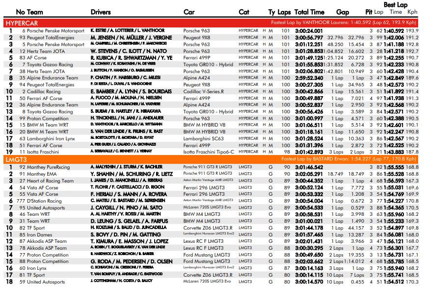 Fino a questo momento non pervenute le Toyota GR010 (con la #7 di Conway in 8a e la #8 di Buemi in 14a), Lamborghini SC63 di Iron Lynx (17a piazza con Kvyat) e Isotta Fraschini Tipo6 LMH (che paga 1″ di passo su Lambo ed è 19a e ultima). Discretamente bene le BMW M Hybrid V8, con la #20 di Renè Rast in 11a posizione e la #15 di Marco Wittmann in 12a che pagano circa 1″ sul passo rispetto ai leader.