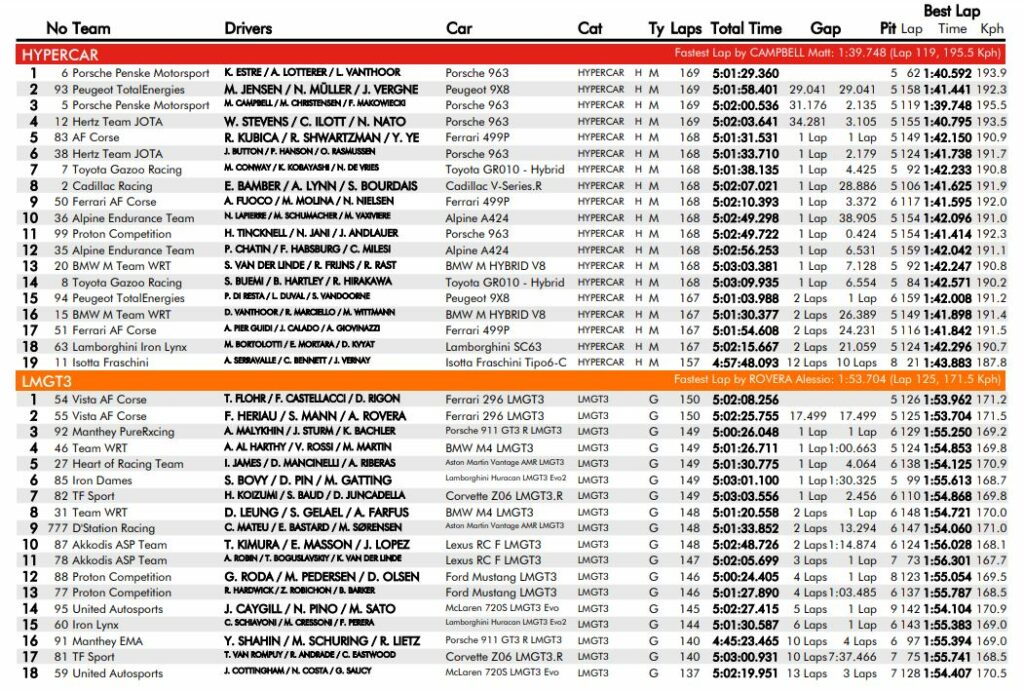 Vittoria che solo la Peugeot 9X8 #93 è riuscita a tratti a mettere in discussione. L’indecifrabile vettura francese è stata protagonista di una gara priva di errori e molto costante. Questo fino a 2 giri dalla bandiera a scacchi. In un colossale deja-vu al sapore di Toyota, la vettura guidata da Jean-Eric Vergne ha subìto un problema tecnico ad un passo dal miglior risultato nel WEC, dopo un grande lavoro svolto lungo tutto il weekend e un’ottima strategia. Per il francese e i suoi compagni Mikkel Jensen e Nico Muller la delusione è atroce, essendo stati in grado di tagliare il traguardo solamente in 7a posizione. Non meglio è andata alla #94, centrata al via dalla Cadillac di Alex Lynn e protagonista di una gara travagliata.