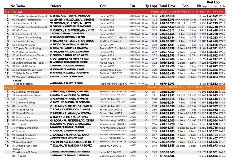 Bella lotta ai margini della top-10 tra due LMDh, ossia Porsche Proton #99 (con Andlauer) e Alpine #36 (con Vaxiviere) che arrivano ai ferri corti in Curva 1, uscendone con la vettura di Stoccarda in 10a posizione e la debuttante Alpine A424 in 11a.