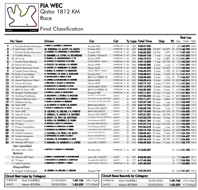 La stagione WEC 2024 non poteva iniziare al meglio: dopo 335 giri intensi il successo è tutto di Porsche, che trionfa in entrambe le Classi e occupa le prime 3 posizioni in classe Hypercar. La Porsche Penske 963 #6 è la vincitrice della prima 1812 KM del Qatar, al termine di 10 ore condotte magistralmente da Estre/Lotterer/L. Vanthoor ma non senza un brivido finale. A vincere in Classe LMGT3 è invece la Porsche 911 GT3 R #92 del team Manthey PureRxcing, con l’equipaggio Malykhin/Sturm/Bachler che inaugurano la nuova era GT nel World Endurance Championship.