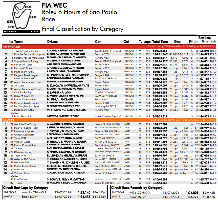 Ecco dunque i risultati completi della 6 Ore di San Paolo 2024