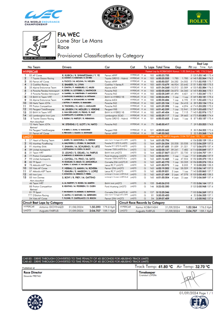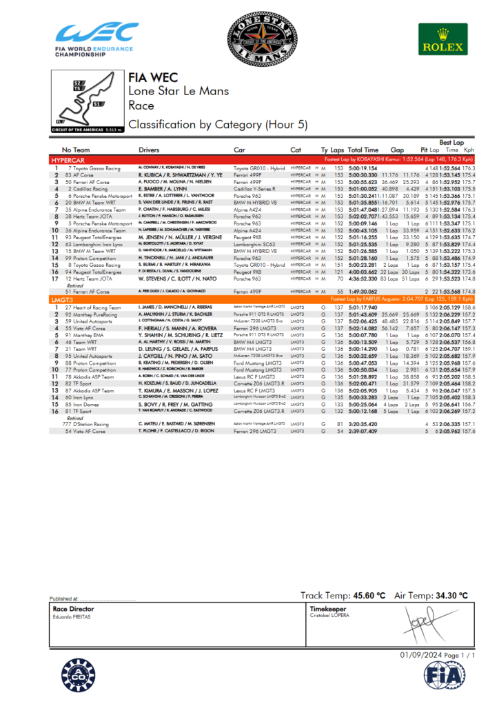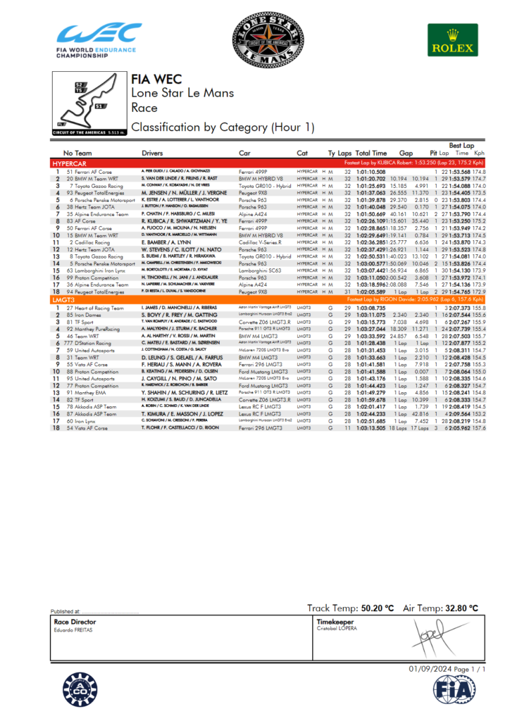 Da sottolineare che dopo 1 ora e 30 minuti i primi 10 in Classe Hypercar sono racchiusi in 33 secondi. Da sottolineare anche che 5 secondi vengono aggiunti sul tempo della Ferrari #51 di Giovinazzi/Calado/Pier Guidi (attualmente 2a a 4″ di distacco dalla #83 di Kubica) a causa di un contatto del pugliese sulla Lexus di Arnold Robin in Curva 7.