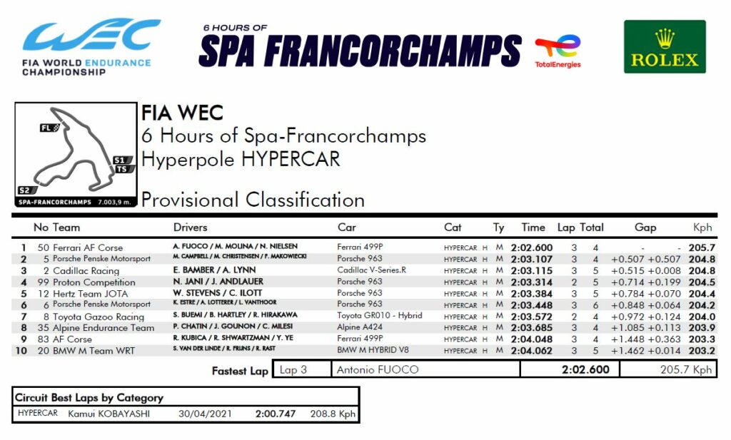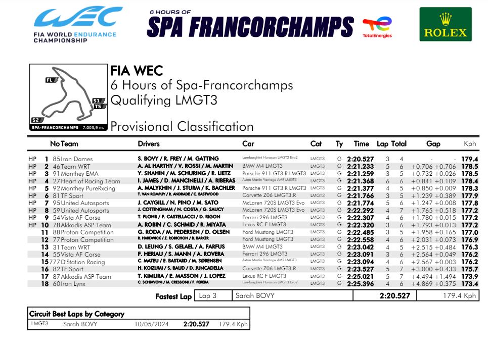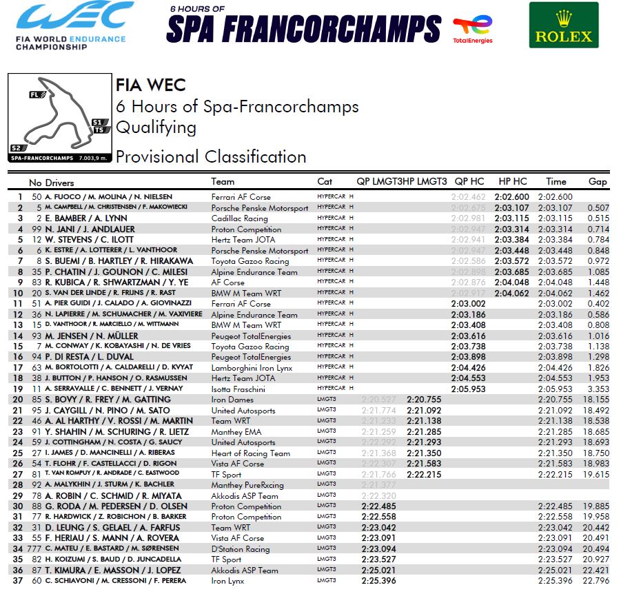 Infine, ecco i risultati completi delle qualifiche per la 6 Ore di Spa 2024, valida come 3° appuntamento del Mondiale Endurance: