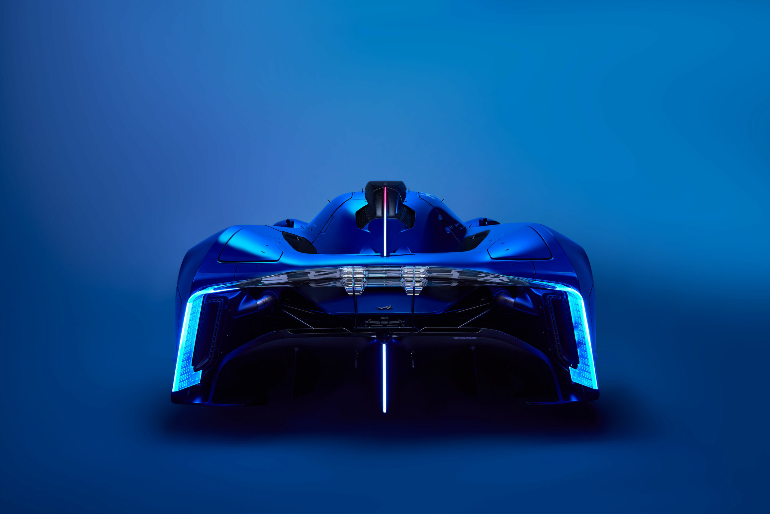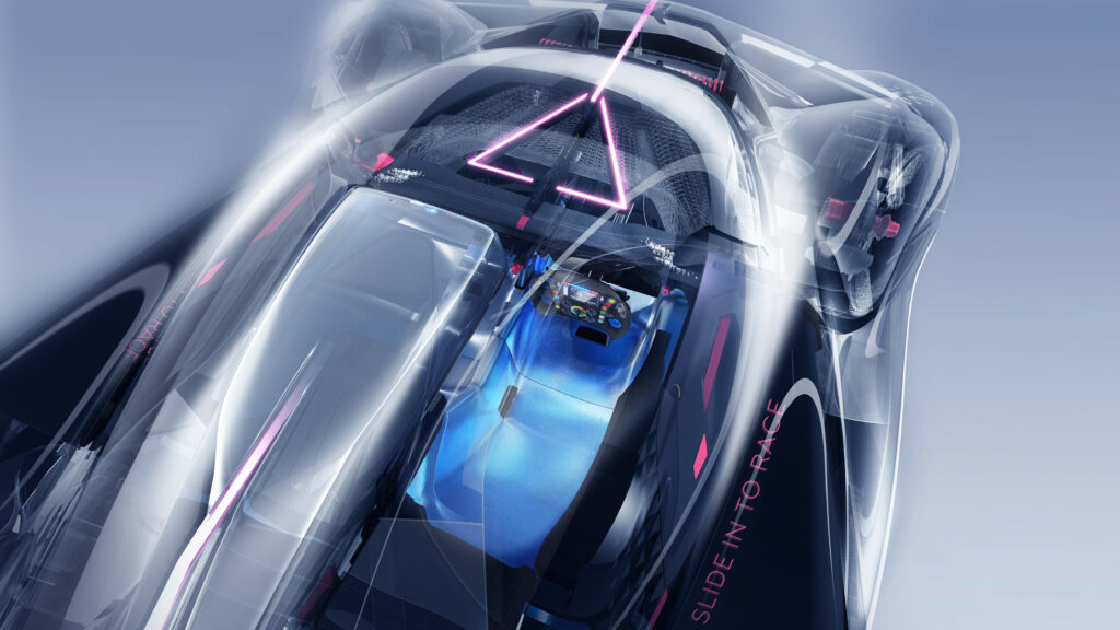 Le dimensioni dell’Alpenglow Hy4 sono di tutto rispetto: il prototipo di Alpine ha infatti una carreggiata di 2.10 metri, una larghezza totale di 2.15 metri, una lunghezza di 5.20 metri e un’altezza di 1.10 metri. All’anteriore la vettura ha una grande presa d’aria che soffia aria verso la parte anteriore del cockpit per poi farla confluire verso il retro della vettura. Le prese d’aria per i radiatori ad acqua e a olio sono del tipo NACA mentre la presa d’aria superiore è simile a quella delle Hypercar attualmente impegnate nel WEC. La forma del posteriore, che ricorda quella della Alpine A220, è stata rivista rispetto al concept iniziale con particolare attenzione all’ampio diffusore, che è stato reso più efficiente. Questo il contributo degli ingegneri, mentre secondo gli addetti del reparto Design di Alpine “il frontale della Alpine Alpenglow a idrogeno è stato progettato per evocare la sensazione di una cometa in arrivo dallo spazio, la cui velocità e penetrazione nell’atmosfera sono suggerite dalle particelle luminose di “polvere cosmica” dei quattro fari anteriori e dal contorno dorsale color magenta. Quest’ultimo diventa blu quando raggiunge la parte posteriore del prototipo, così come le luci verticali accanto ai tubi di scarico verticali in titanio, che simboleggiano l’idrogeno e il vapore acqueo emessi dalla combustione“.