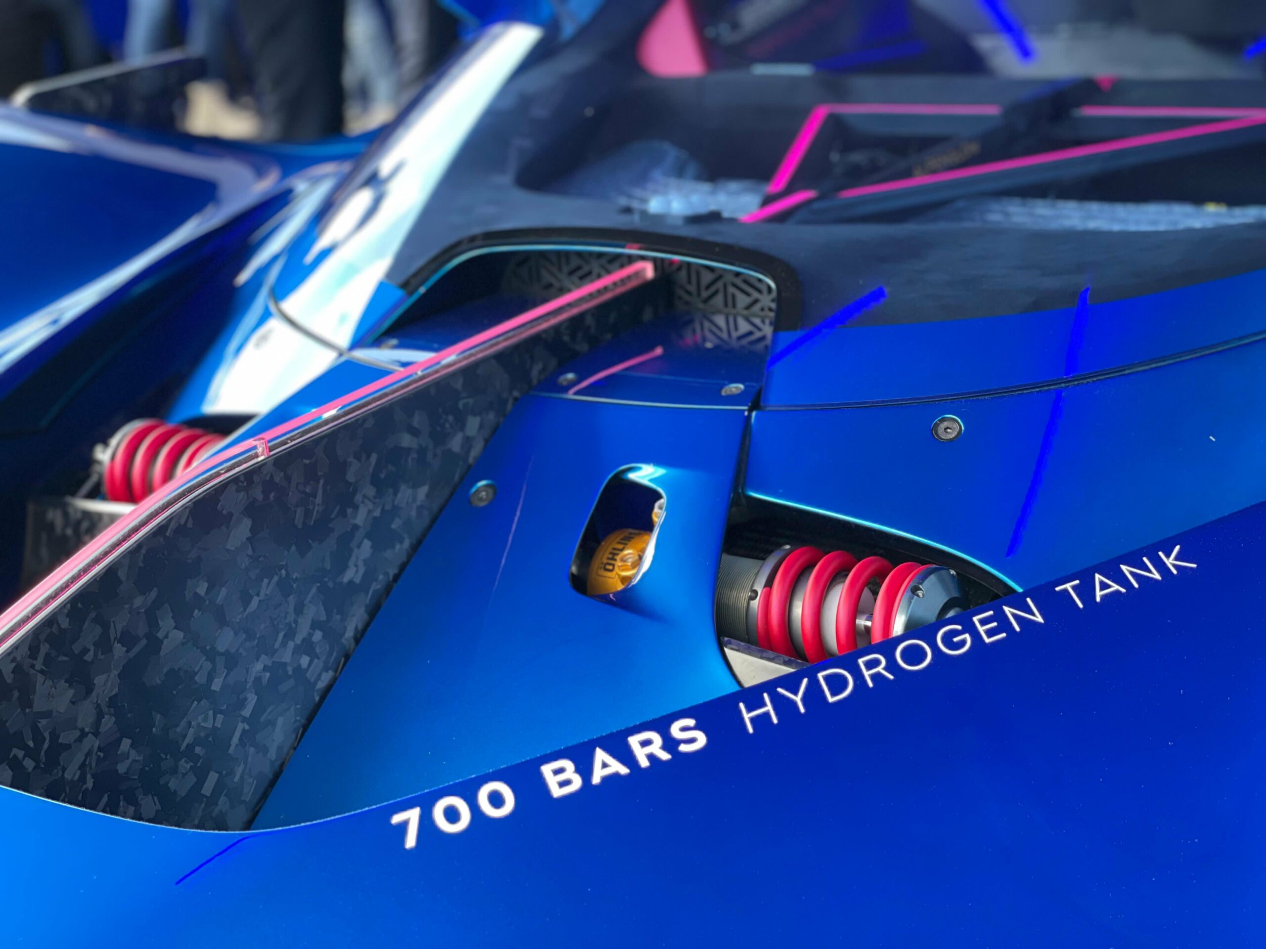 Sulla Alpine Alpenglow Hy4 l’idrogeno viene immagazzinato in 3 serbatoi posizionati ai lati e dietro al cockpit e in grado di contenere 2.1 kg di idrogeno in forma gassosa l’uno. Dal momento che l’idrogeno a temperatura e pressione ambiente ha una densità di circa 0.089 kg/m3, per immagazzinare questi 2.1 kg in tali condizioni sarebbero stati necessari serbatoi da 23 m3. Poiché in Alpine miravano a costruire un prototipo e non un autoarticolato, i serbatoi della Alpenglow Hy4 mantengono l’idrogeno a 700 bar di pressione in modo tale da diminuire il volume totale richiesto per immagazzinare il gas. Prima di essere iniettato in camera di combustione a 40 bar il combustibile deve passare attraverso un regolatore di pressione intermedio che abbassa la pressione dai 700 bar del serbatoio a 200 bar. Data l’altissima pressione interna ai serbatoi e l’alta infiammabilità dell’idrogeno sono state prese diverse contromisure per evitare di fare la fine dell’Hindenburg: i serbatoi sono certificati secondo il Regolamento numero 134 dell’Unione Europea, ovvero quello che regola le misure di sicurezza da adottare per i veicoli a idrogeno. Oltre a questo sono presenti valvole che garantiscono la rapida evacuazione in caso di incendio, sensori che monitorano in continuazione la presenza di idrogeno, una lunga check-list da effettuare per mettere in moto la vettura e un sistema di allerta con un codice a colori per segnalare i pericoli (similmente alle luci rosse/verdi per indicare problemi al sistema ibrido in Formula 1). Nel render sottostante possiamo apprezzare il posizionamento dei serbatoi ai lati del cockpit.