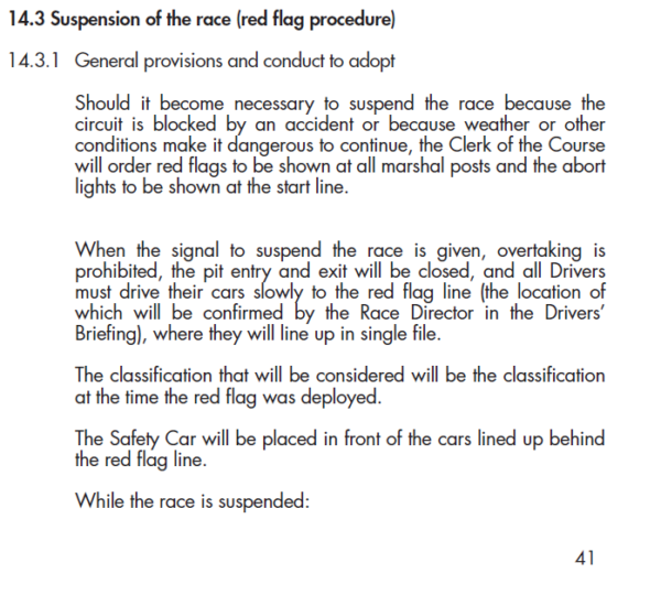 La prima parte del punto 14.3.1 del Regolamento Sportivo del WEC fornisce alcune indicazioni generali sui comportamenti da tenere all’esposizione della bandiera rossa per portare le macchine in una condizione di sicurezza, come mostrato nell’immagine sottostante.