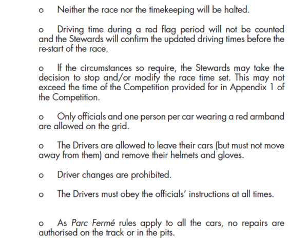 - Il tempo di guida durante un periodo di bandiera rossa non verrà conteggiato e gli Steward confermeranno i tempi di guida aggiornati prima del ripartenza della corsa.