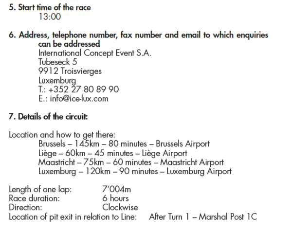 I punti che ci interessano di più sono il primo, dove viene detto che la gara e il cronometraggio non vengono fermati, e il terzo, che autorizza i commissari a modificare il tempo di gara previsto a patto che questo non superi il tempo fornito nell’Appendice 1 della Competizione, ovvero 6 ore in questo caso. Durante la 6 Ore di Spa quindi i commissari hanno lasciato scorrere il cronometro come previsto dal regolamento per poi creare un varco spazio-temporale che annullava il tempo di gara appena trascorso e lo sostituiva con un’ora e quarantaquattro di gara in modo da rimanere entro le 6 ore di gara previste dal regolamento. Sotto vengono riportati alcuni estratti dell’Appendice 1 della 6 Ore di Spa e della timetable ufficiale.