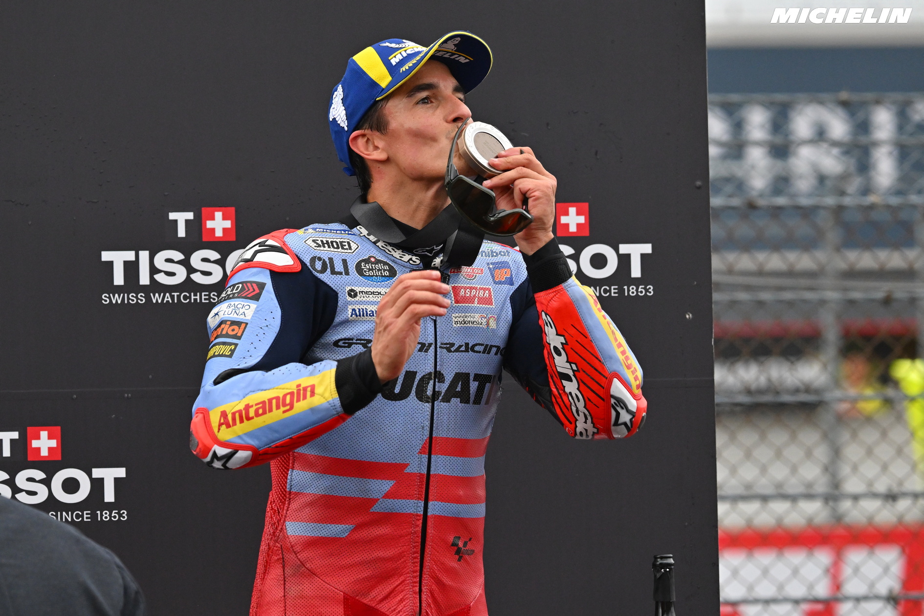 Marc Marquez morde la medaglia di bronzo nella Sprint del Giappone, dopo una battaglia corpo a corpo con Bastianini.