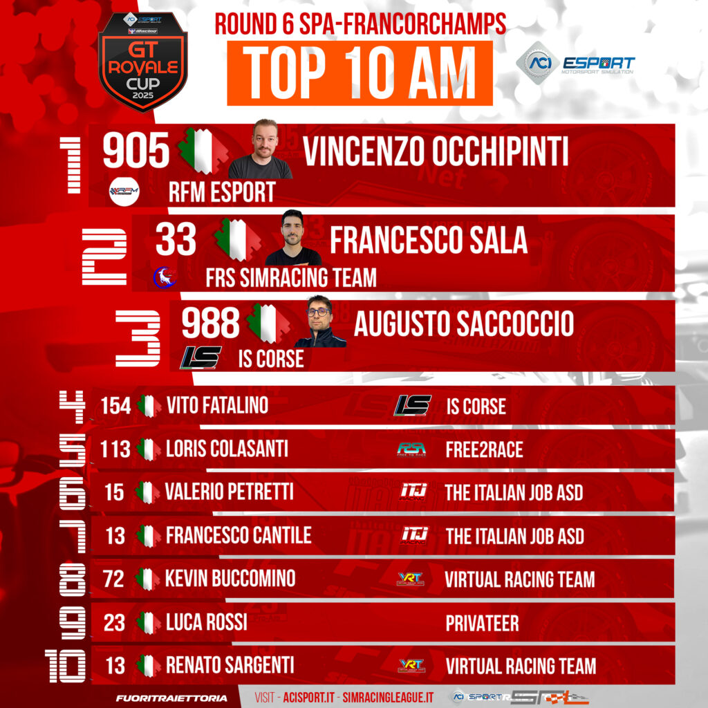 Le classifiche del settimo round del Campionato ACI eSport GT Royale Cup 2025