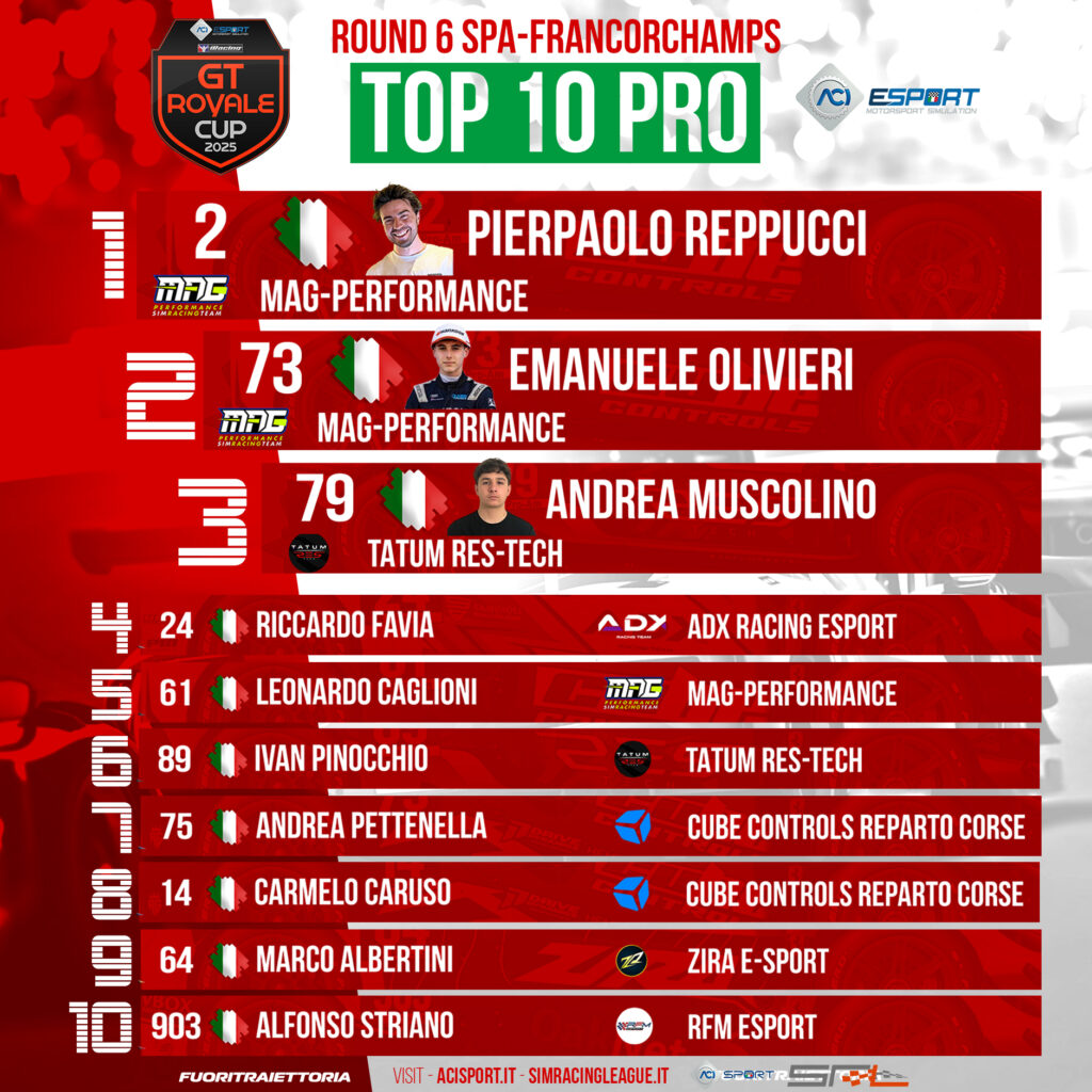 Il circuito di Spa-Francorchamps ha ospitato il sesto e ultimo round del Campionato ACI eSport GT Royale 2025, organizzato da Sim Racing League su iRacing. Le splendide curve del tracciato belga hanno fatto da cornice a una gara ricca di colpi di scena che ha consegnato i titoli PRO e Overall a Reppucci e quello AM a Occhipinti. Un risultato per certi versi inaspettato, dal momento che i due neo-campioni arrivavano a questo appuntamento occupando il terzo posto rispettivamente nella classifica Overall e in quella AM.