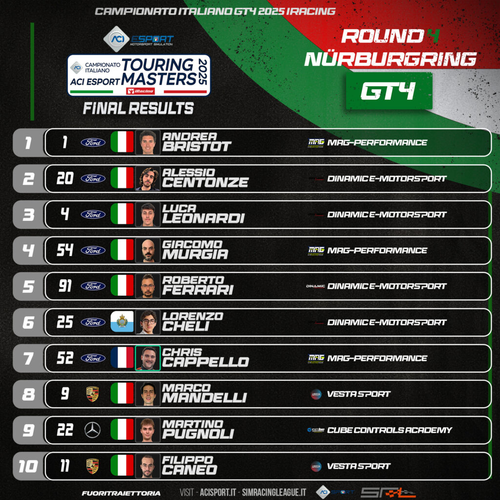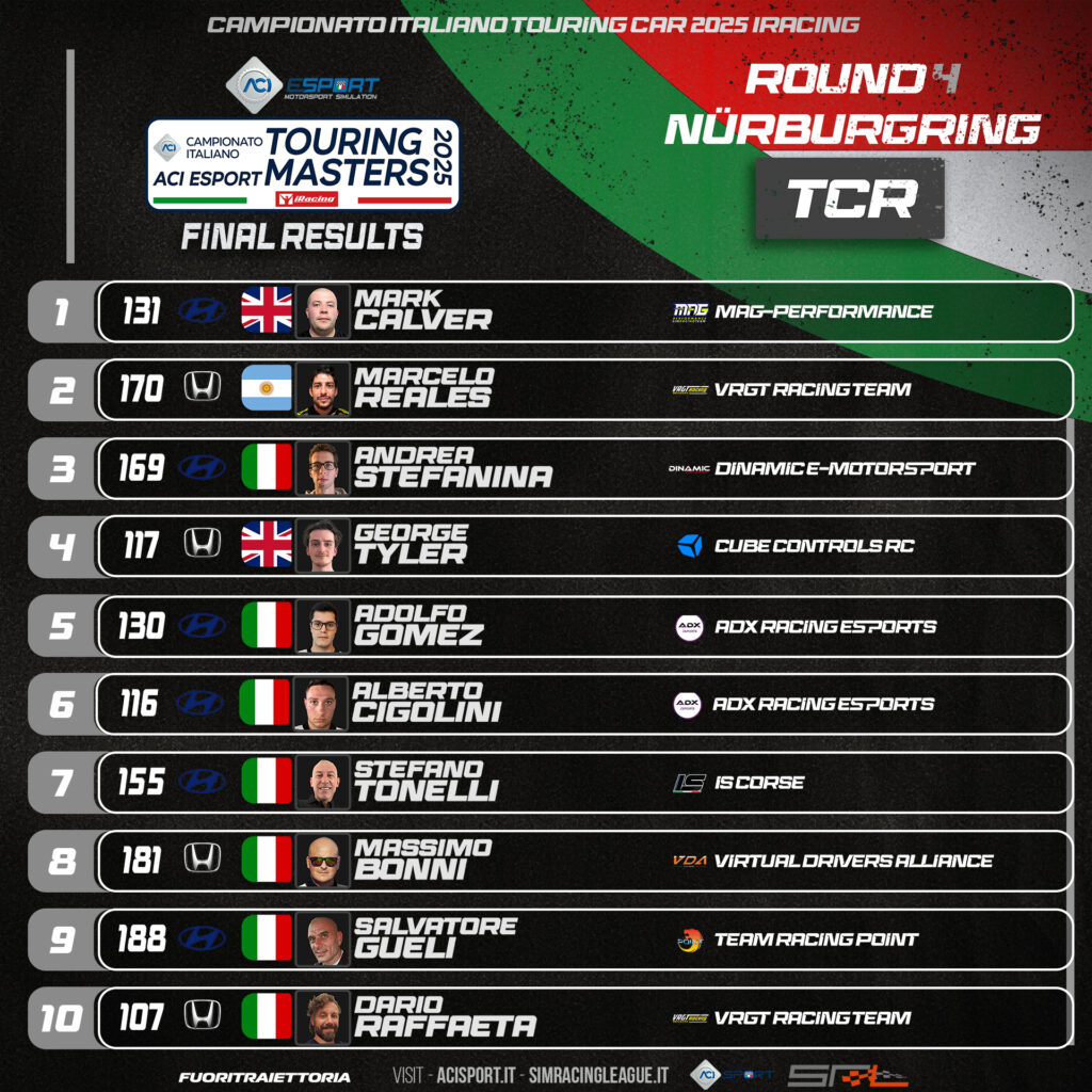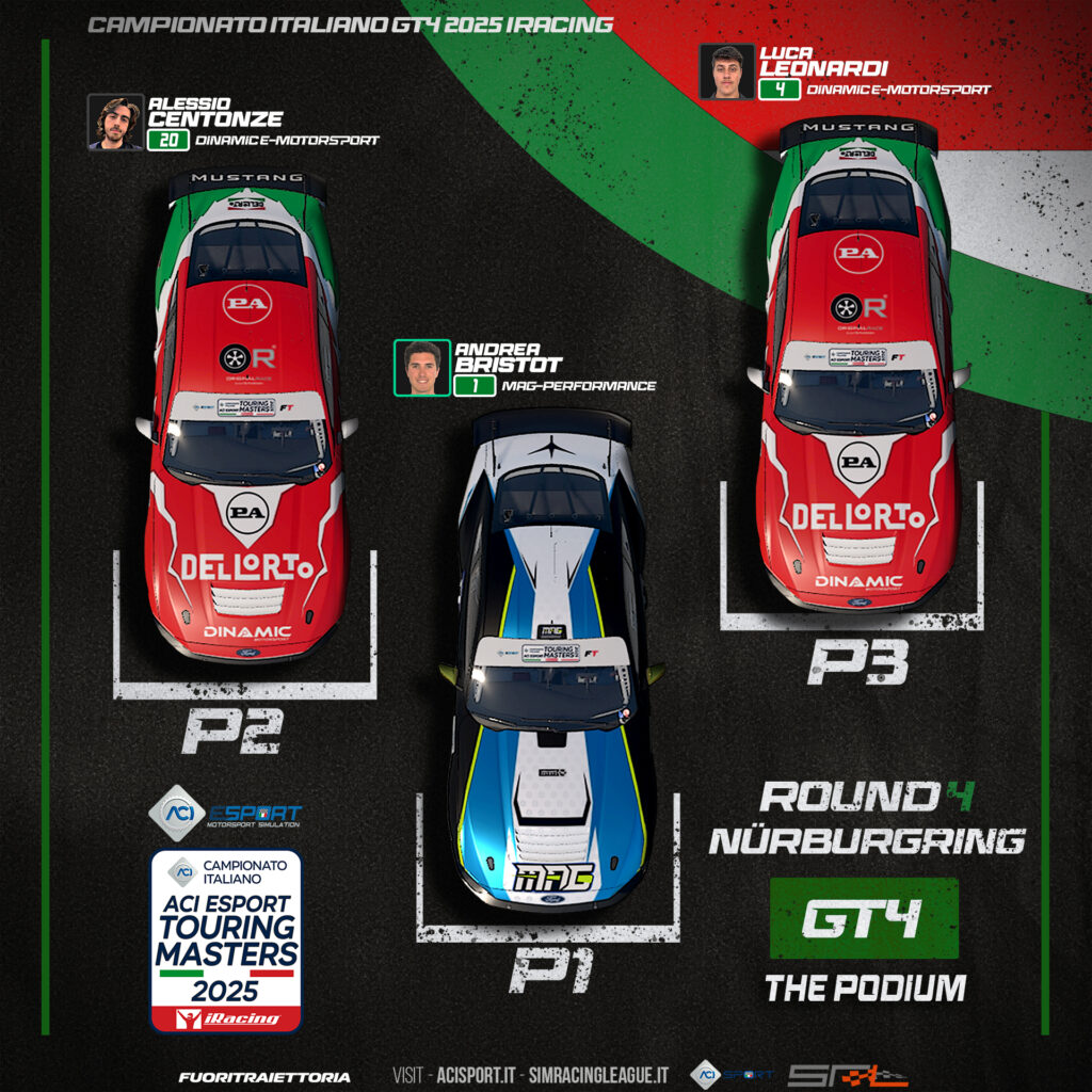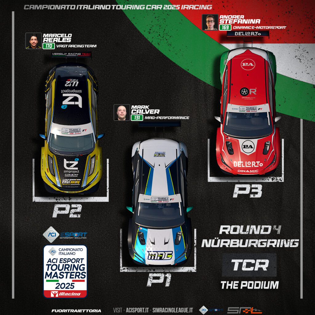 Andrea Bristot ha vinto anche il quarto round dell’ACI Esport Touring Masters 2025 in classe GT4. Vittoria di Mark Calver invece in TCR